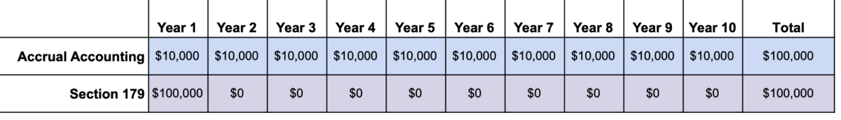Under the Section 179 rule, a business can elect to deduct the full value of a capital expenditure (machinery, furniture and fixtures, buildings, etc.) in the first year it was put into service. Under this rule, you can offset up to $1 million in taxable income with a capital investment, which could be include machinery, computers, equipment, tooling. See below for a comparison chart of a $100,000 capital investment under straight-line accrual versus Section 179.