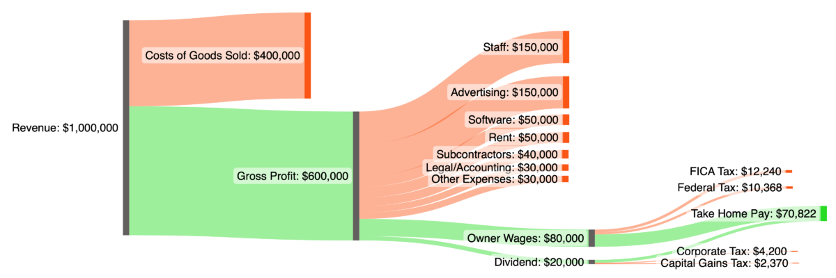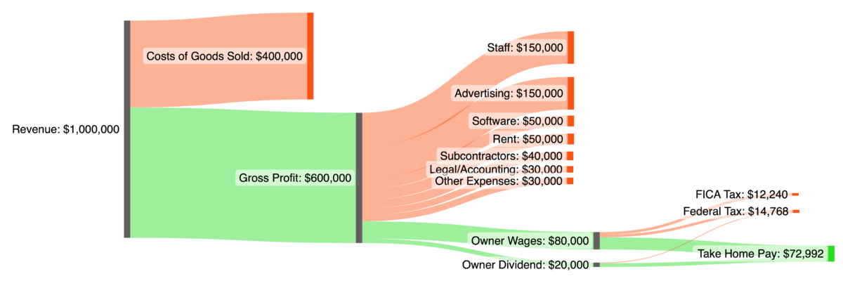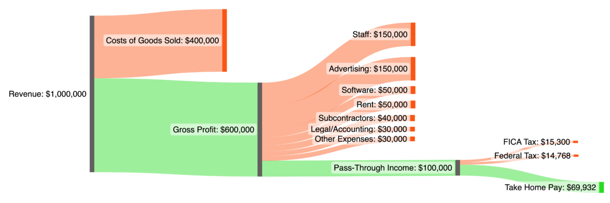 Here is a simple flow diagram showing a simple eCommerce business with $1 million in revenue, 40% COGS, and $100,000 in profit passed through to the single-filer owner after other expense items: